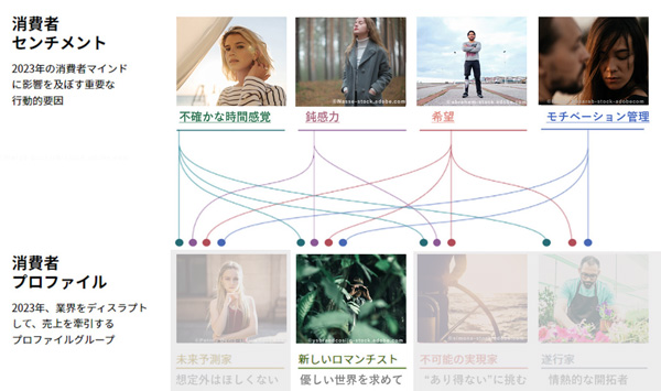 次にご紹介したいのは、もっと良い世界を一緒に作ろうという、人に優しい世界を求めている前向きな人々「新しいロマンチスト」です。このグループもまた4つのセンチメント「不確かな時間感覚」「鈍感力」「希望」「モチベーション管理」のすべてが関連すると分析されています。