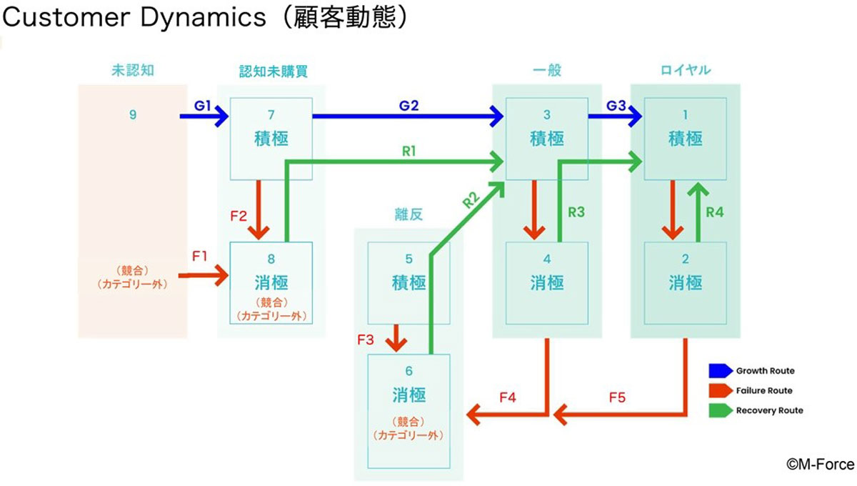 顧客が動くパターンは3色の矢印、12パターンに分類されます。青色の矢印(Growth Route)は事業成長につながる移動、赤色(Failure Route)は事業の衰退につながる移動、そして緑色(Recovery Route)は回復につながる移動です。たとえばGrowth RouteであるG1ルートは、「seg.9 未認知顧客」から、次回購買意向のある「seg.7 積極認知未購買顧客」へと動くことを表しています。Failure Routeの一つであるF1ルートは、「seg.9未認知顧客」の認知は獲得したものの、便益と独自性が理解されなかったり、ニーズやインサイトに合わなかったりしたことで「seg.8消極認知未購買顧客」に移動するケースを示しています(※2)。
