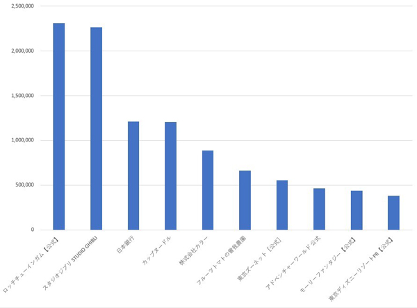 下の図は、年間を通して獲得したエンゲージメント総量が高かった企業のTwitter公式アカウント上位10件です。前述の施策ランキングのトップ10にも入っていた、ロッテチューインガムとスタジオジブリが1位、2位と続いています。いずれも、打率・燃費効率の高さがうかがえます。