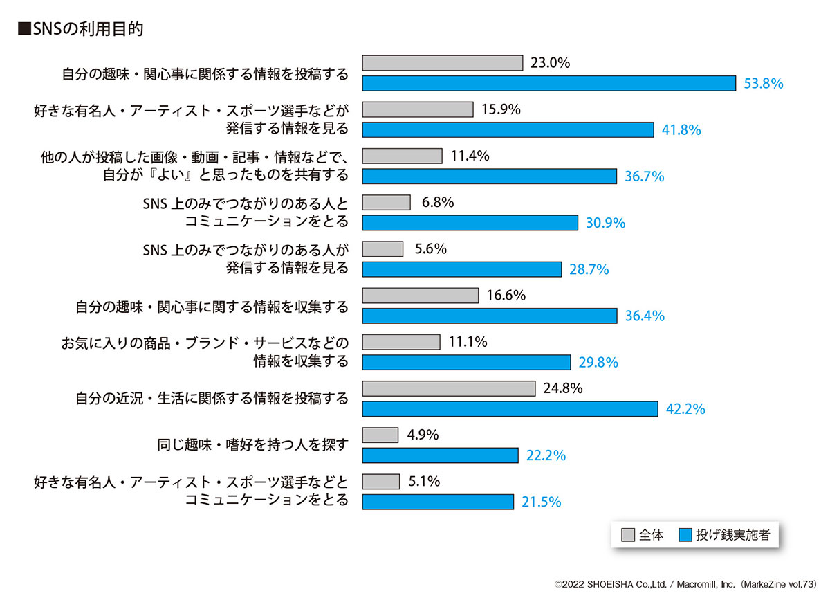 SNSの利用目的としては「自分の趣味・関心事に関係する情報を投稿する」「自分の近況・生活に関係する情報を投稿する」「好きな有名人・アーティスト・スポーツ選手などが発信する情報を見る」が上位だが、「他の人が投稿した画像・動画・記事・情報などで、自分が『よい』と思ったものを共有する」という点からは応援するライバーのプロモーション的な要素での利用や、「SNS上のみでつながりのある人とコミュニケーションをとる」「SNS上のみでつながりのある人が発信する情報を見る」からはコミュニケーション目的でのSNS利用もうかがえる(図表4)