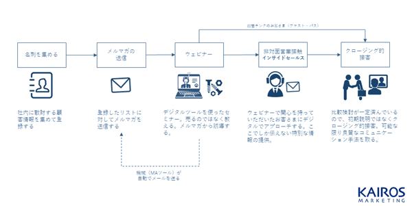メルマガから直接ウェビナーに誘導し、ウェビナーで好感触のお客さまにインサイドセールスをすることで、少ない人数で全国営業展開できるようになります。