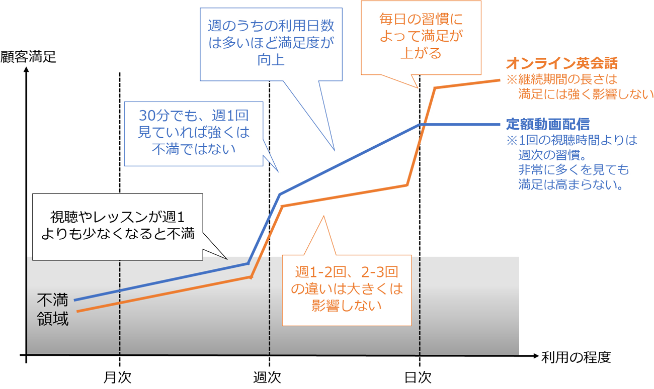 第1に、図に示されているように、定額動画配信サービスもオンライン英会話スクールも、「これ以上利用が減ったら満足度が下がる」という閾値が、週1回の利用を下回るかどうかという点にあることがわかりました(グラフ中の「週次」の部分)。