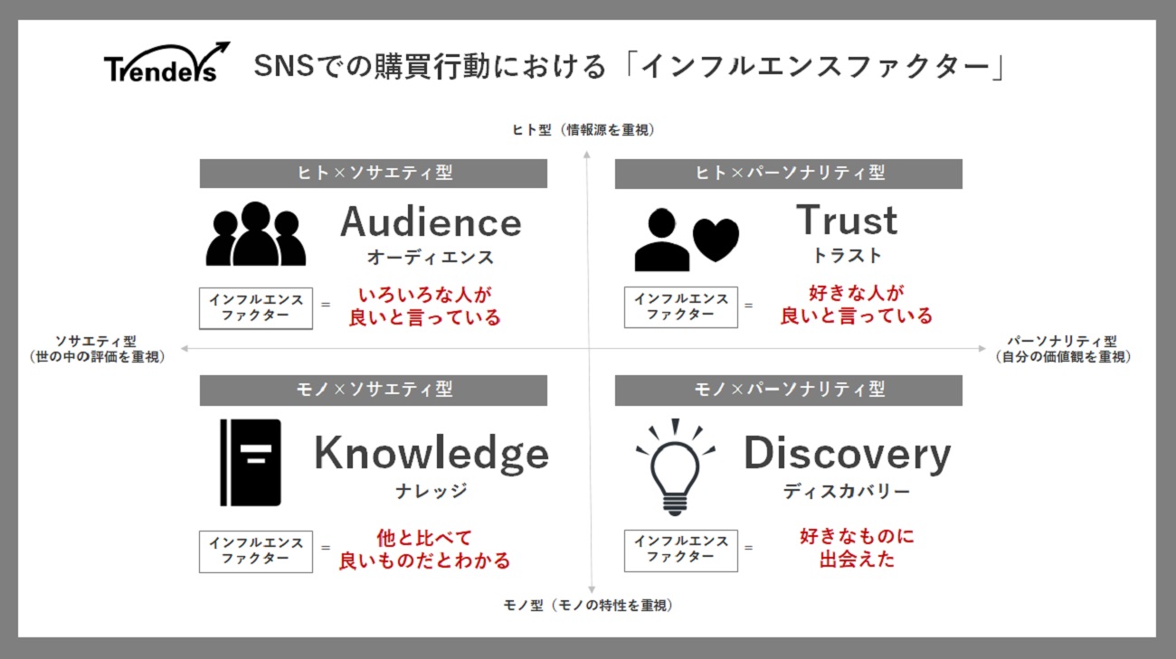 そこでトレンダーズではSNSユーザーを対象に定量・定性調査を複数実施し、「属性」ではなく「購買行動パターン」を軸にSNSユーザーを分類しました。この考え方を「インフルエンスファクター」として体系化しています。