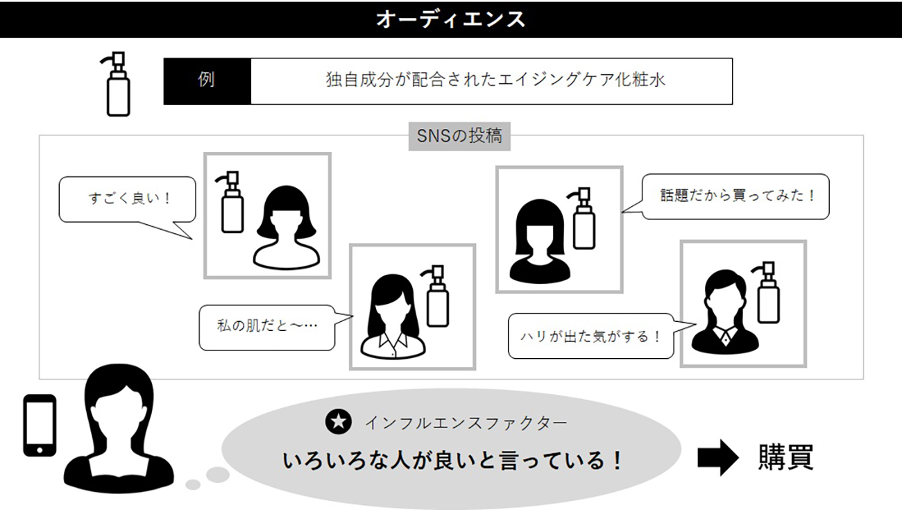 1つひとつのクチコミをじっくり見るというよりは、SNSで検索をしたときに直感でたくさんの人がいいと言っているかを判断する傾向にあります。そのため、年齢、ライフスタイル、肌質など様々な人に商品を体験してもらえる施策でクチコミのバリエーションを生み出すのが効果的です。