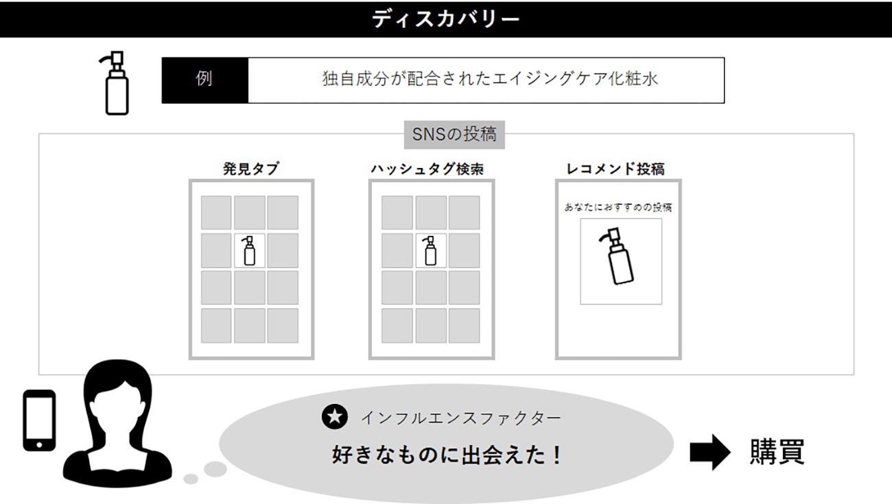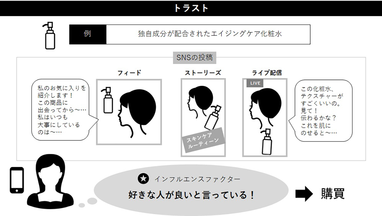 SNS上に、センスや審美眼を信頼できる憧れの人・好きな人がおり、「その人が支持をしていると知る」ことが購買における最大の影響要因になるケース。