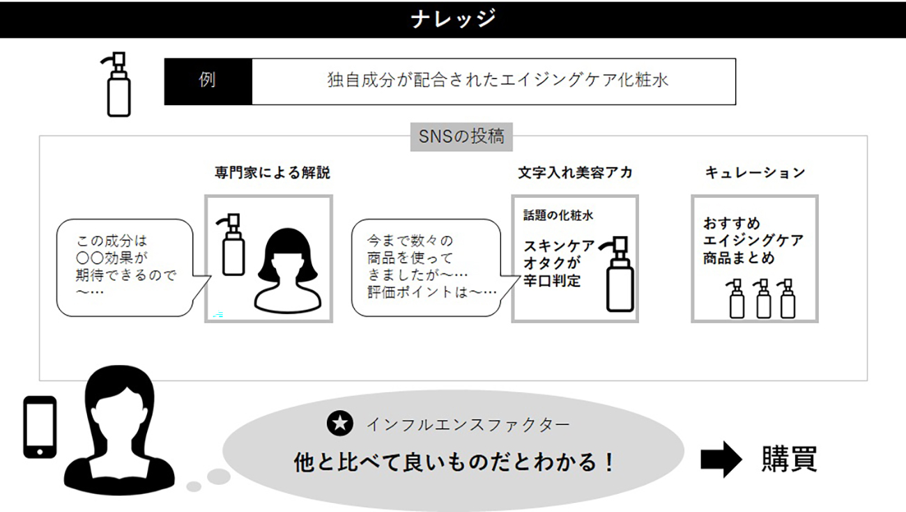 美容商材であれば、美容のプロフェッショナルによる機能性の解説コンテンツや、Instagramで人気の文字入れまとめ投稿などが効果的です。「なぜその商品がいいのか」を理解させる必要があるので、商品USPの整理や競合商品とは異なるコピーワークなども重要になります。
