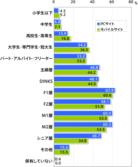 PCサイト、モバイルサイトそれぞれのターゲット層を尋ねたところ、モバイルサイトのターゲット層の上位は「F1層」(61%)と「M1層」(56%)という結果となりました。また、学生層をターゲットにする場合、モバイルサイトがPCサイトを上回る結果となりました。学生向けのマーケティングでは、PCよりモバイルが有効だと考える企業が多いようです。