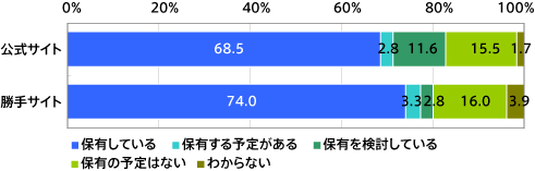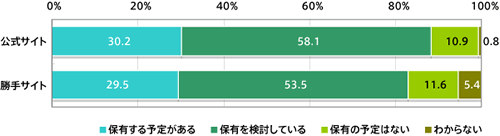 次に、今後モバイルサイト保有予定(現在未保有)の企業に、公式サイトと勝手サイトの保有予定について尋ねたところ、公式サイトは88%、勝手サイトは83%の保有意向と、公式サイトが勝手サイトを上回る結果となりました。