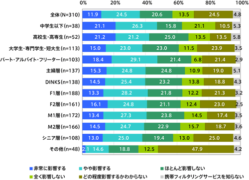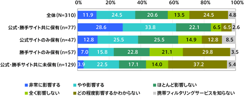 携帯フィルタリングサービスの導入によるモバイルサイトへの影響を尋ねたところ、全体で、36%が影響すると回答しました。また、保有サイト別では、公式・勝手サイト共に保有している企業の62%、公式サイトのみ保有企業の38%、勝手サイトのみ保有企業の23%が影響すると回答しました。次に、モバイルサイトのターゲット別に見てみると、「非常に影響する」、「やや影響する」と回答したのは「パート・アルバイト・フリーター」(48%)をターゲットとしている企業が最も高く、次いで「中学生以下」(47%)、「高校生・高専生」(42%)との結果となりました。