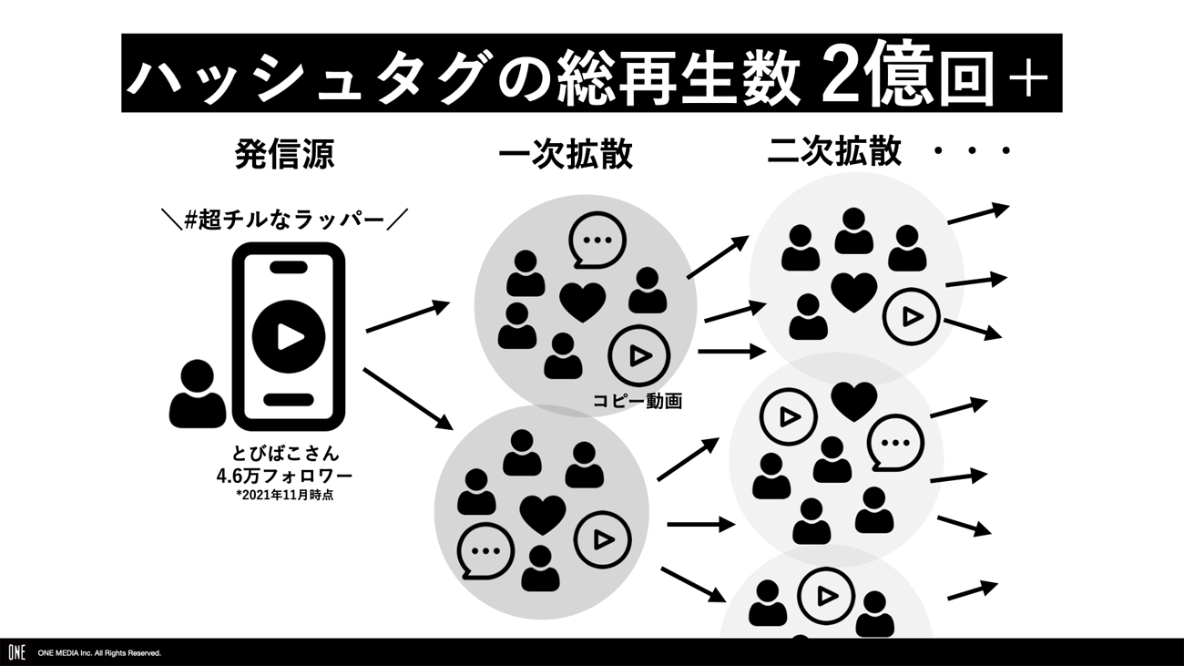 ここで1つ事例を紹介しましょう。2021年にTikTokで大流行した「#超チルなラッパー」をご存知でしょうか? 現時点(2022年3月)で合計2億回以上再生されている一大現象になったハッシュタグです(テキストだと、おもしろさが伝わりづらいので、ぜひ動画を見てみてくださいね)。