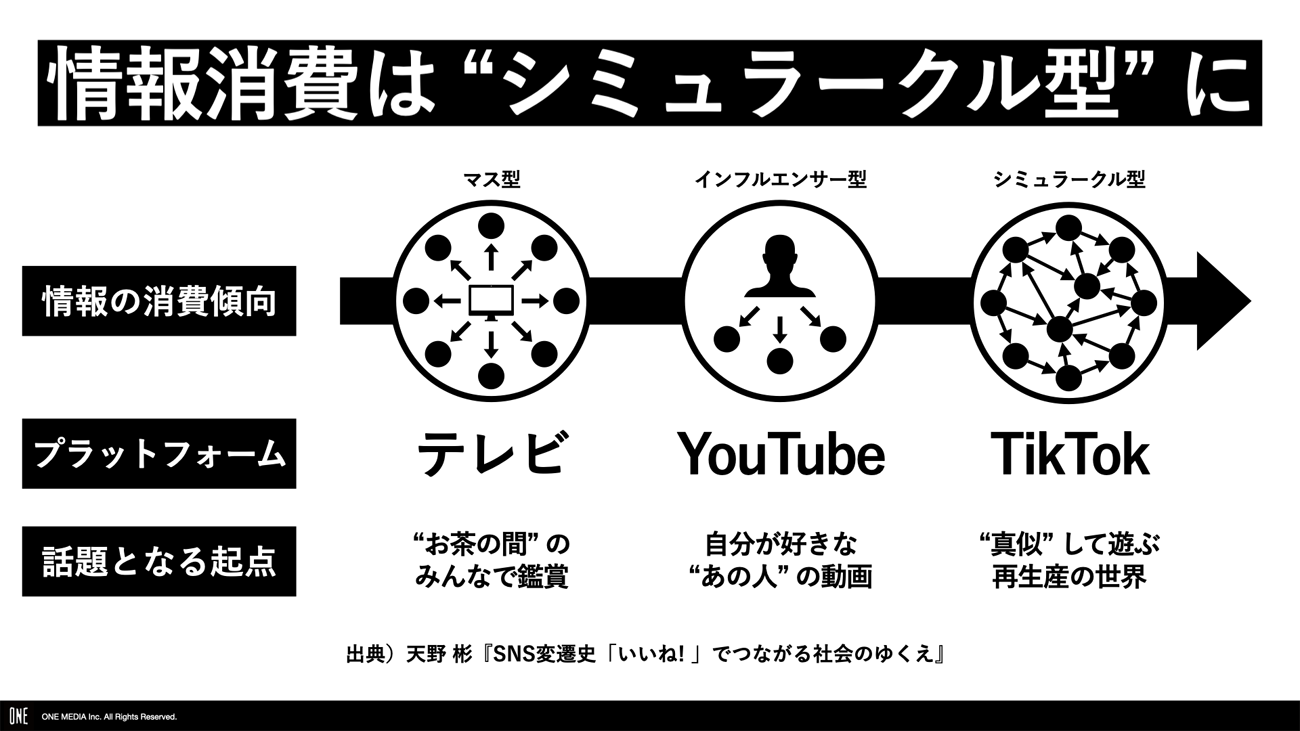TikTokでは、“誰でも”話題の発信源になり得ます。この情報消費の新しいあり方は「シミュラークル型」と呼ばれています。