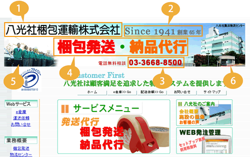 最後にちょっと余談です。第2回と今回とで、八光社梱包運輸のWebを、「素人っぽい」とか「たいしたことはない」と書いてきた。実際、このWebは、神林専務がにわか勉強の後に、ホームページ作成ソフトで自力で作ったものなので、文字通りシロウトの手作りだ。しかし、実は私、このWeb、デザイン的にもいいセンいっているんじゃないかと思っています。
