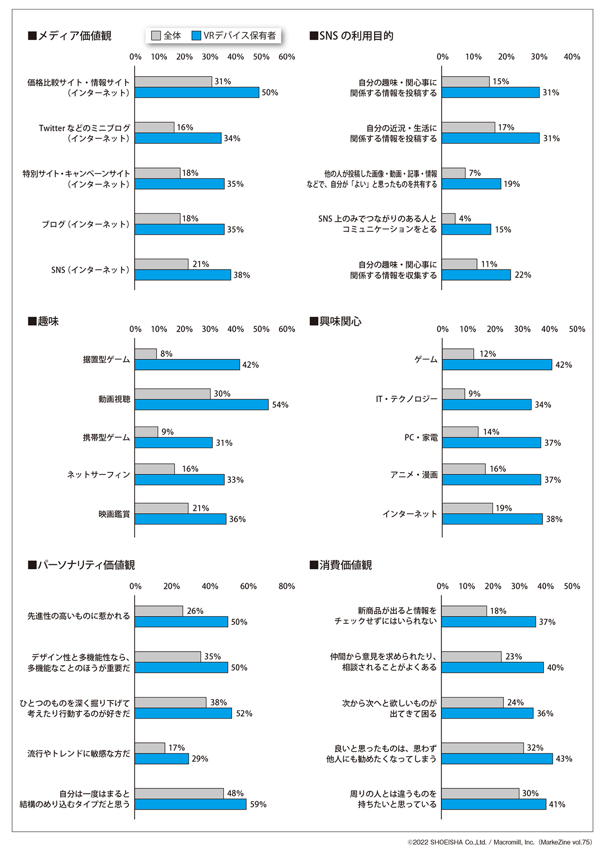 パーソナリティ価値観では「ひとつの物を深く掘り下げて考えたり、行動したりするのが好きだ」や「自分は一度はまると結構のめり込むタイプだと思う」が高い。周囲に邪魔されずに自分の世界に没頭したいタイプのためVRデバイスを好んでいるのではないかと考えられる。一方で、消費価値観では「仲間から意見を求められたり、相談されたりすることがよくある」や「良いと思ったものは、思わず他人にも勧めたくなってしまう」といった社交的な面もある。趣味の情報収集とともにトレンドをいち早くチェックしている傾向から、SNSでの趣味友達との情報交換も活発に行っていると予想される。