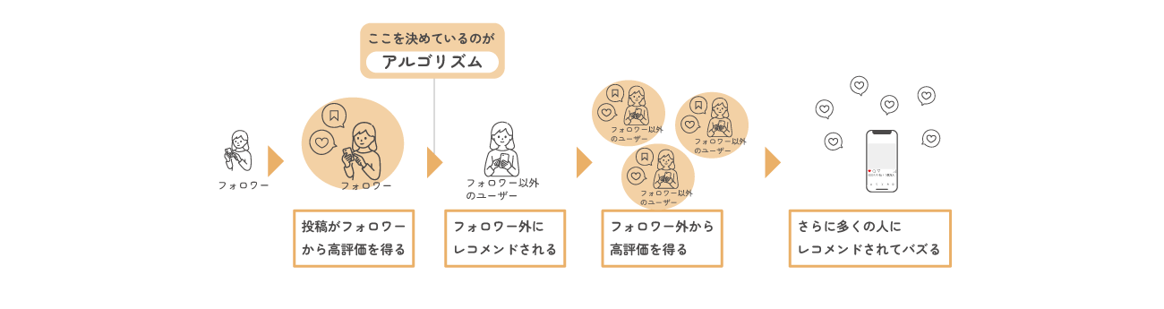 フォロワー以外のユーザーにレコメンドされた後は「その投稿がフォロワー以外から高評価を得られるか」が重要になります。初めてそのアカウントを見るユーザーは当然アカウントのファンではないので、この際に問われるのはシンプルな「投稿の質」です。投稿がユーザーにもたらす便益が大きければその投稿の評価は高まり、プラットフォーム側はさらに多くの新しいユーザーに対してレコメンドしてくれます。