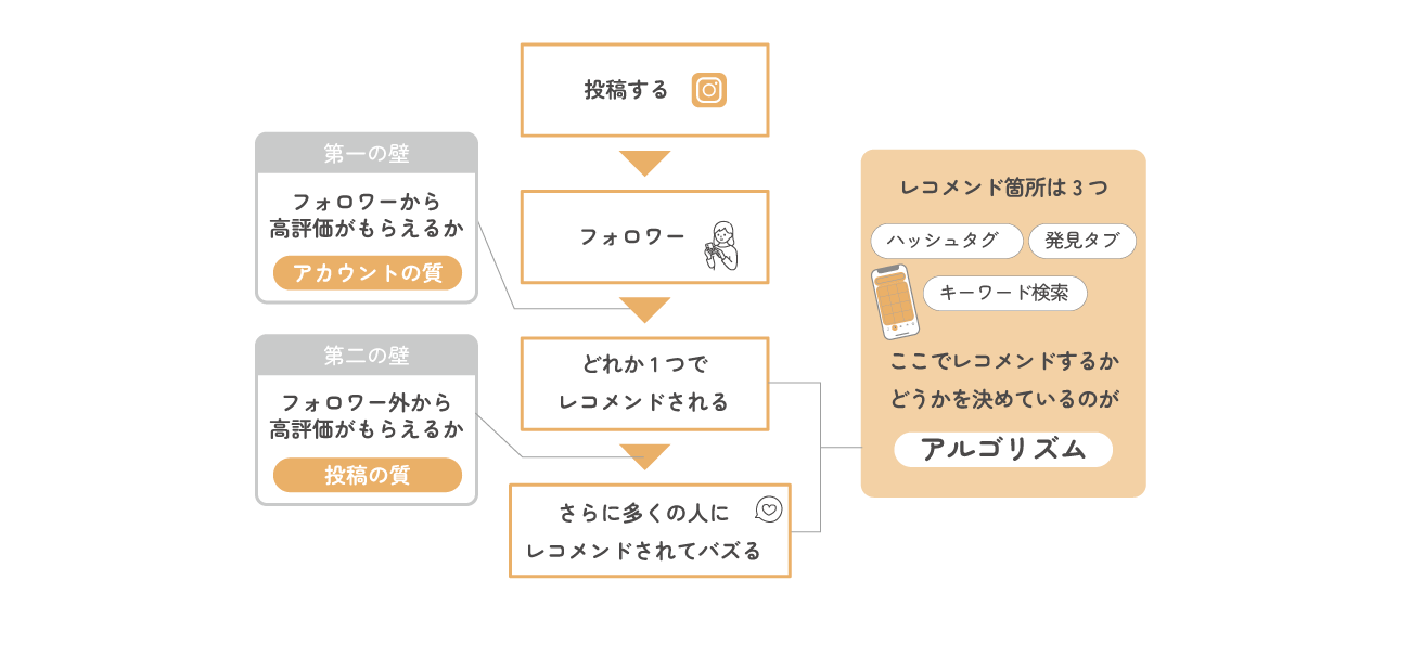 これまでの流れをまとめると、Instagramにおいてバズるまでには「2つの大きな壁」があることがわかります。まず第一は「フォロワーから高評価がもらえるか」。そして第二に、フォロワー以外から高評価がもらえるか。