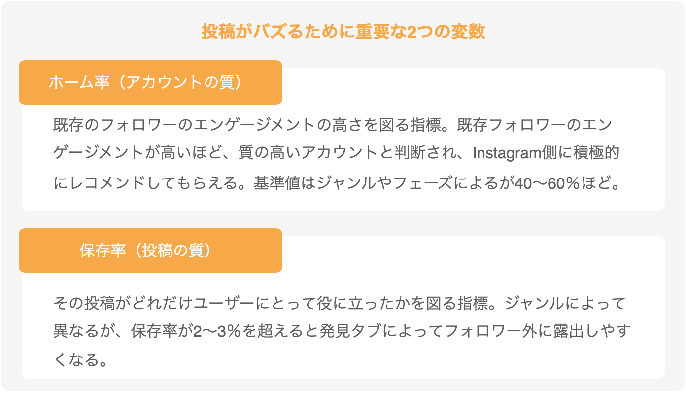 ハッシュタグも発見タブもレコメンドされる場所が異なるだけで、表示されるかどうかはアルゴリズムによって決められます。繰り返しお伝えしますが、運用で重要なのは「アカウントの質」と「投稿の質」を最大化することです。この2つが高ければ、自然とInstagramにレコメンドされてバズります。