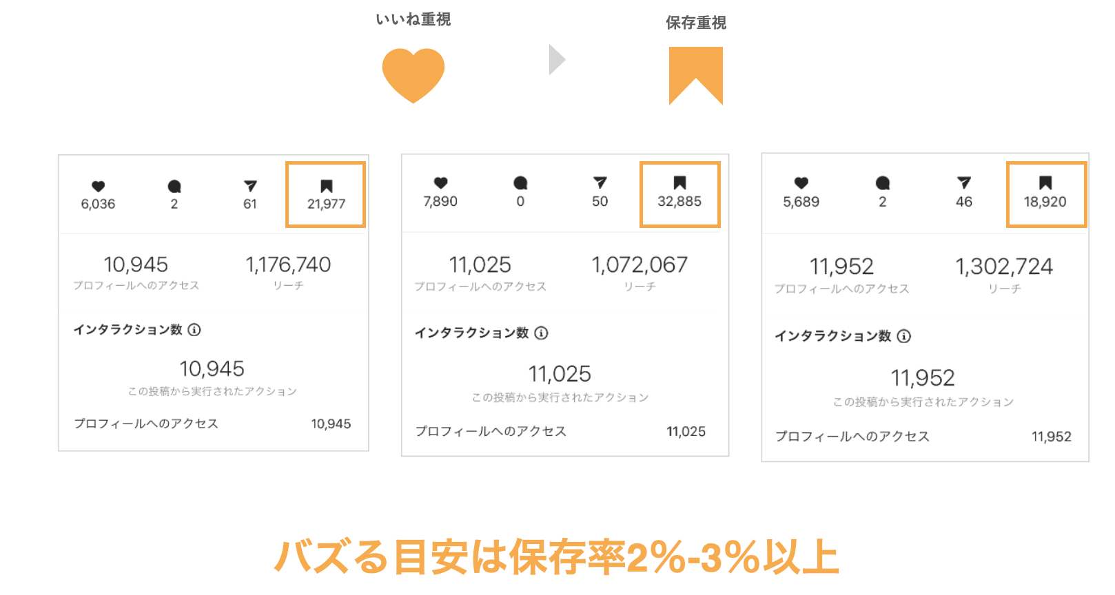 よく「100万リーチ越えの事例」をお伝えすると驚かれますが、実は意外とそこまで難しいことではありません。上記の2つの数値基準をしっかりと満たしているアカウントは、基本的には100万リーチ越えの「バズ投稿」を連発しています。ぜひ、運用する際のKPI設定の目安として参考にしてみてください。