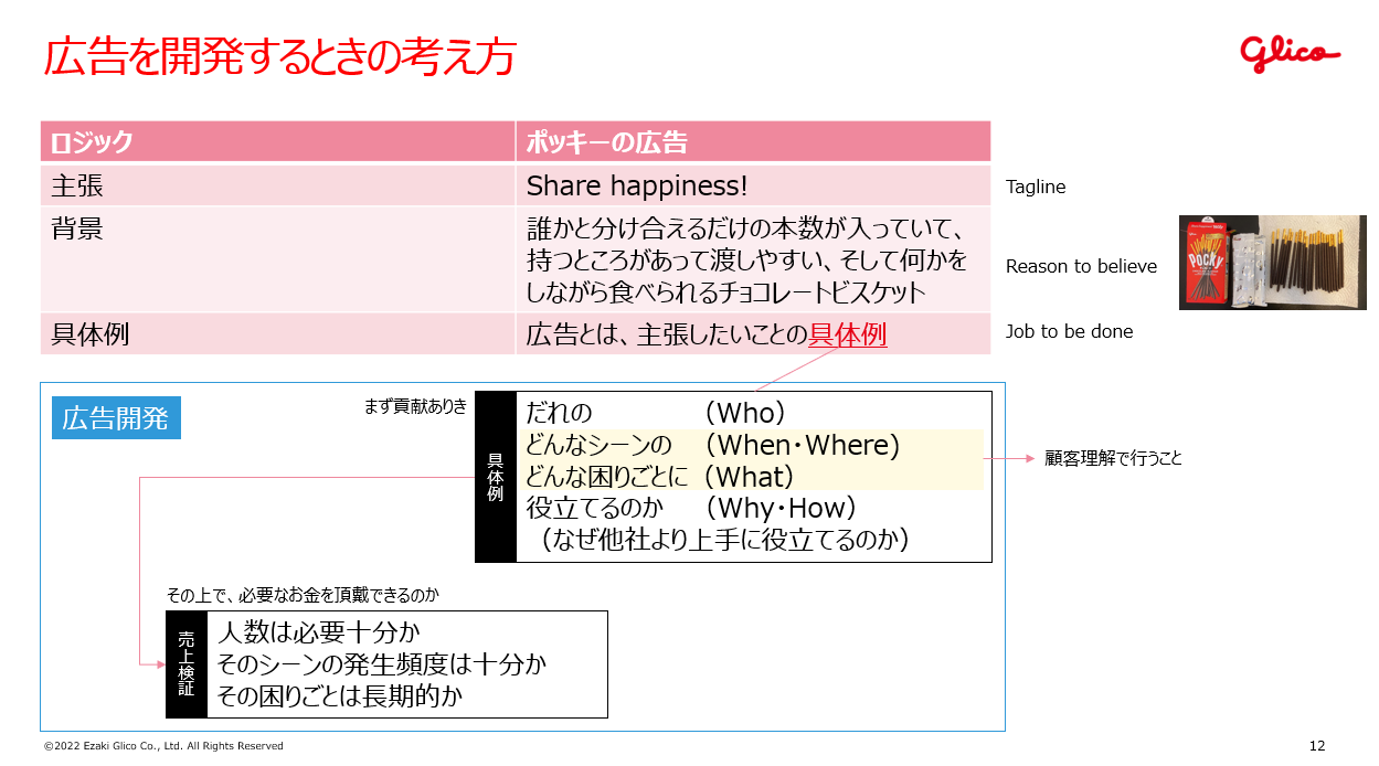 ポッキーの場合、主張にあたるのは全世界共通のスローガン「Share happiness!」だ。「誰かと分け合えるだけの本数が入っていて、持つところがあって渡しやすく、何かをしながら食べられるチョコレートビスケット」という背景が主張を裏付ける。そして具体例は説得する対象によって最適な内容が異なるため、それを「5W1Hで整理しながら見つけ出す」と玉井氏は話す。