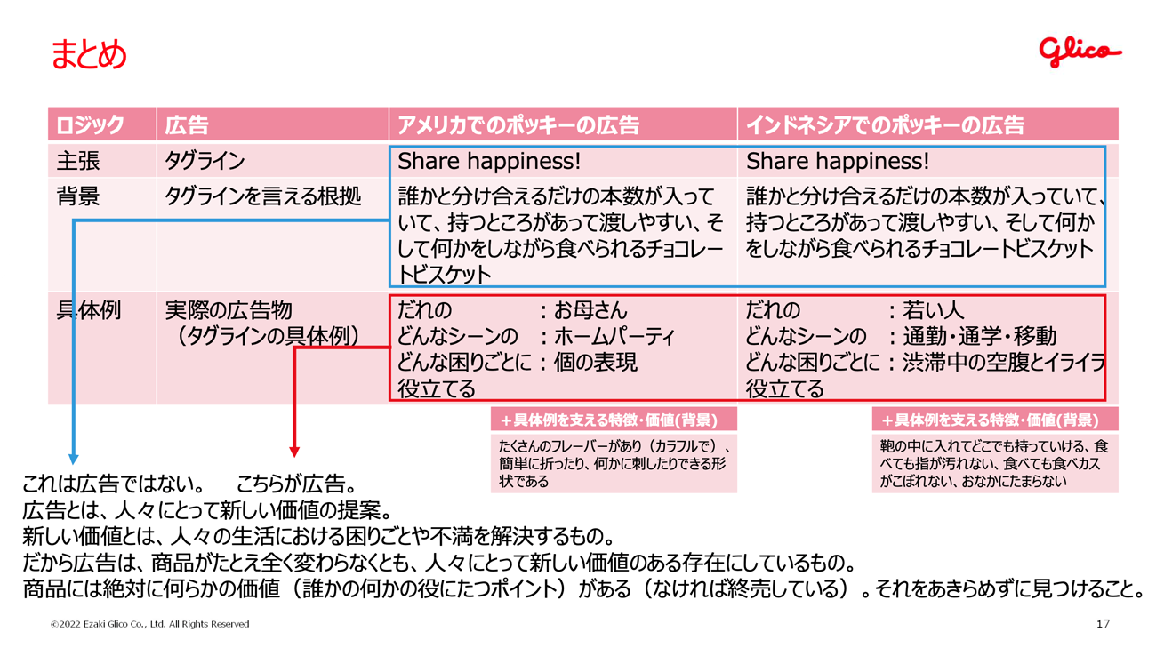 アメリカとインドネシアでの事例を踏まえ、玉井氏は広告を「何らかの困りごとを解決する新しい価値の提案」と定義。その上で「商品には必ず誰かの何かに役立つポイント、すなわち価値があるので、それを諦めずに探し続けることが大切」と強調する。