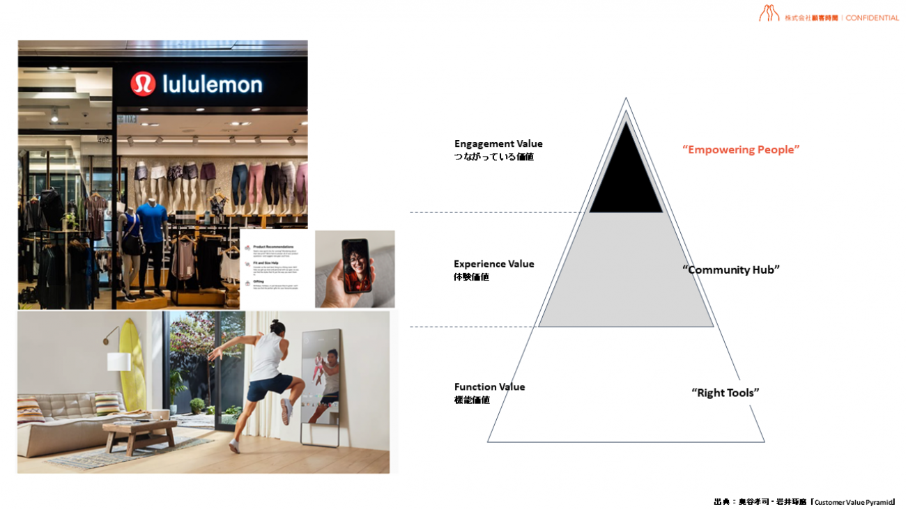 再び奥谷氏が講演者となり共有したのは、デジタルを前提とした時代に合わせて事業システムをシフトした、米国のヨガウェア専門店「lululemon(ルルレモン)」の事例だ。当初lululemon社は、ヨガウェアの物販だけを顧客とのエンゲージメント(つながり)としていたが、提供する価値をモノ(ヨガウェア)からコト(Empowering People)と変えることで、顧客とのエンゲージメントを深める方向を探った