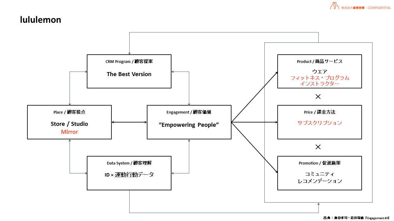 lululemon社のケースを新たな4Pで見てみると、顧客に提供する価値はヨガウェアというモノから" Empowering People"というコトに変わった。加えて新たな場(鏡型デバイス)を通じ、売り買い以外でもいろいろなデータを取得できるようにした。そうして取得したデータも踏まえ、どんなProductを顧客に提供すべきか(ヨガウェア、フィットネスプログラムなど)、Priceはどうすべきか(売り切り、サブスクリプション)、Promotionは何を提供すべきか(コミュニティ、おすすめのサービスなど)を設計していく、という流れになる。