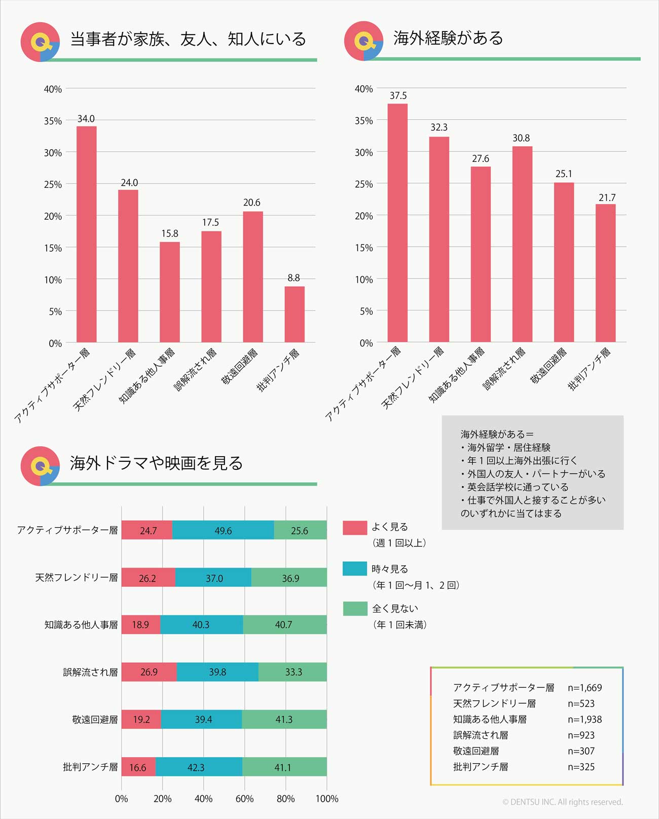 中川:アクティブサポーター層と天然フレンドリー層を合わせると、サポーティブな意見を持っている方が全体の4割となり、希望の持てる結果であると思っています。アクティブサポーターは、当事者が身近にいたり、海外居住の経験があったり、また海外ドラマをよく見る方が多い傾向にあります。これを踏まえると、知識ある他人事層や敬遠回避層の方々は、自分事化するきっかけがこれまであまりなかった人たちなのかもしれない、という仮説が出てきます。リアルな機会だけでなく、メディア接触も含めて、少しでもきっかけがあれば意識が変わるような層も一定数いると捉えています。