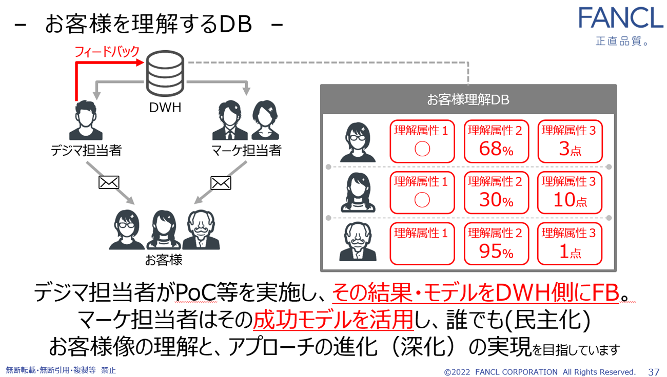 こうしたことを繰り返して成功モデルを積み重ね、それを他の担当者にも水平展開している。このように専門性が高くない担当者でも顧客理解ができ、アプローチを進化させられるような環境をファンケルでは「データの民主化」としている。現在は「まだ始めたばかりで適切な業務PDCAが回せていないが、成果にこだわって迅速に対応していく」と長谷川氏は語った。