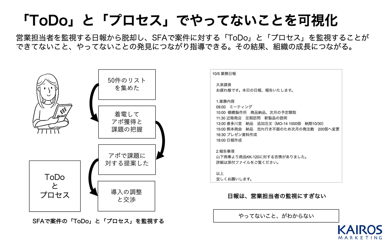 従来の営業日報との違いは、日報はやったことしか見えないことに対し、ToDoはやっていないことも見える点。まだやってないことを、しっかりやるだけで営業の業務効率がアップします。