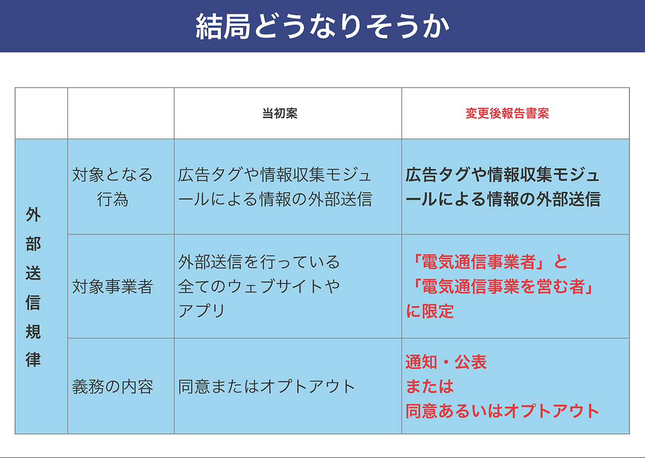 対象事業者は「電気通信事業者」と「電気通信事業を営む者」に限定され、義務の内容も通知・公表、または、同意あるいはオプトアウトと緩和された。ユーザーの同意やオプトアウトは必須なく、公表していればデータを利用できるようになったのだ。また、自社のサーバーにデータを送信する場合も例外となった。