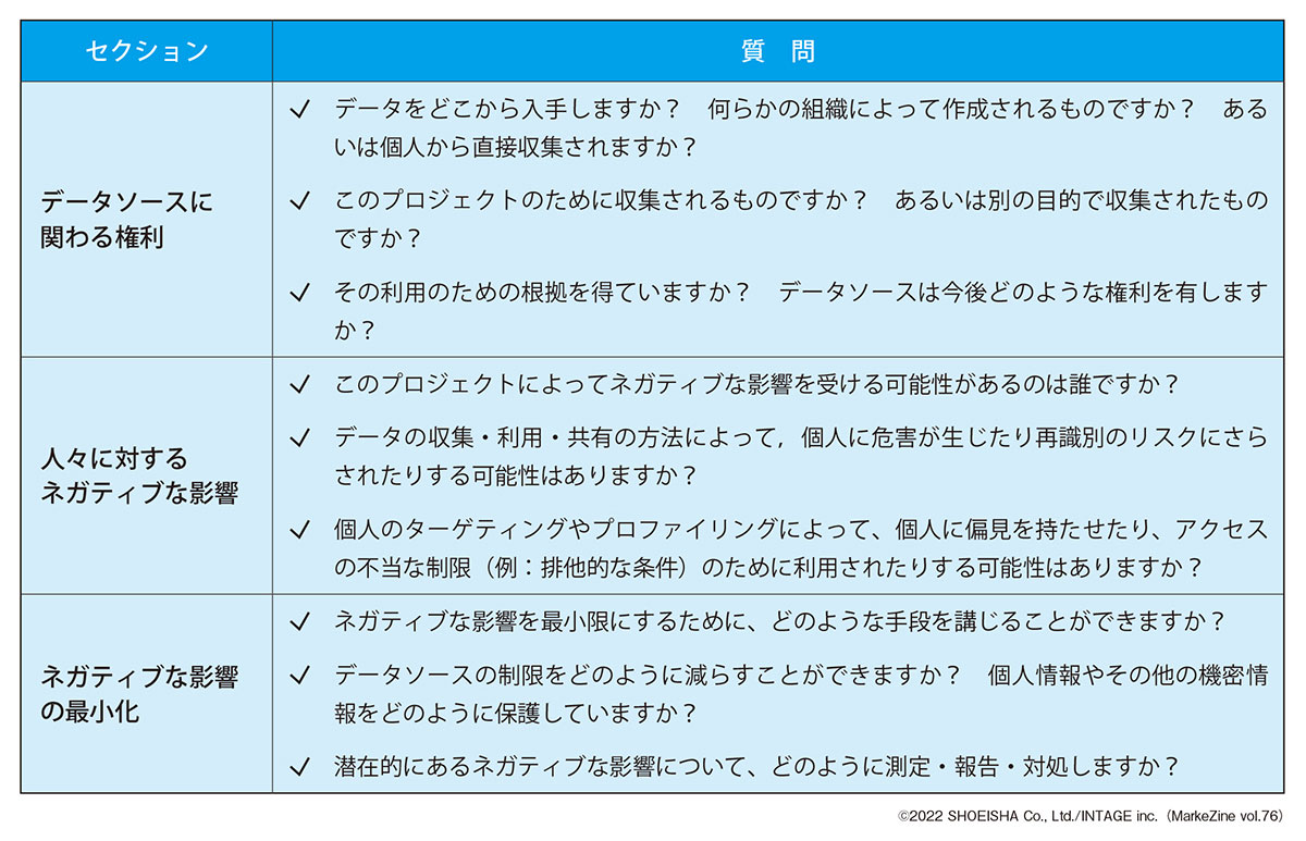 本稿では、データ倫理とは何か、そして自社のサービス開発やマーケティング施策における“ネガティブな影響”のリスクを考える必要性を説明してきたが、“ネガティブな影響”とともに“ポジティブな影響”を考えることもData Ethics Canvasでは重要なトピックである。“ネガティブな影響”については、個⼈情報やパーソナルデータの収集・利活用が伴うサービスや事業を開始する際に、事前に個人の権利利益を侵害するリスクを特定し評価する手法である「プライバシー影響評価(PIA:Privacy Impact Assessment)」でも同様に重要とされているが、データを活用するからこそ実現できるユーザーへの便益といった“ポジティブな影響”を考えることについては考慮されていない。