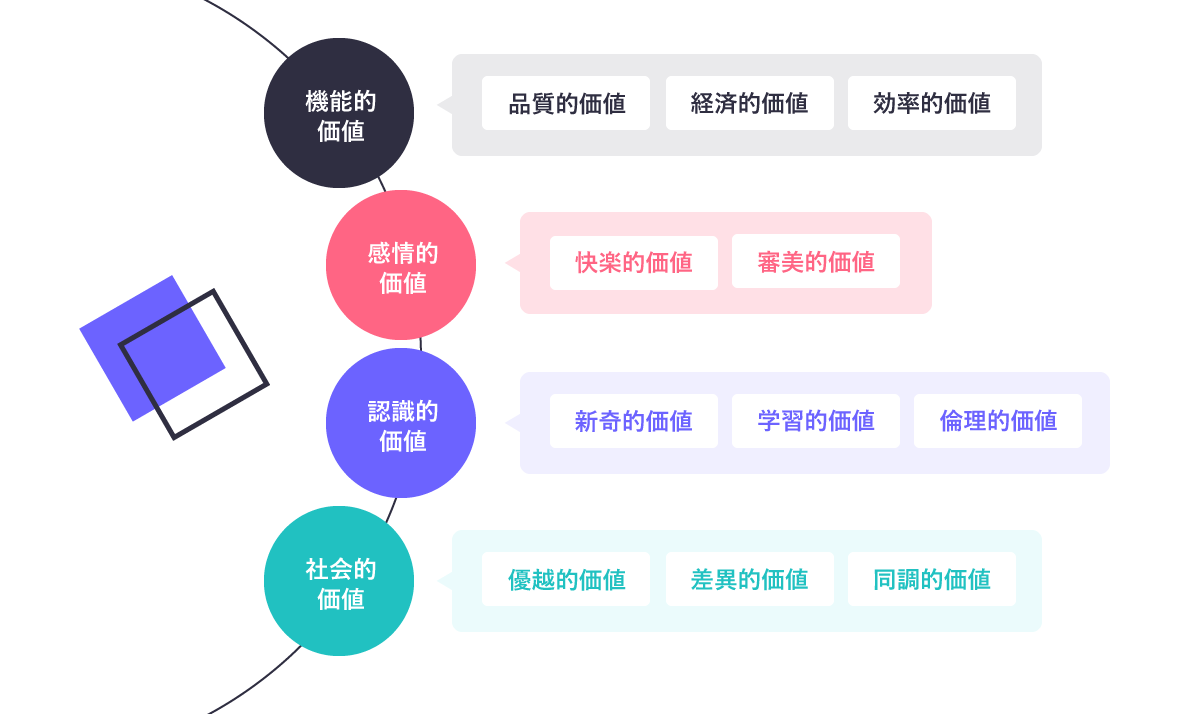 ですが、そこから一段階上がり、消費者が認識する価値(WHAT)を体系的に理解できれば、WHO・WHAT・HOWの解像度を高められ、消費者との関係性を構築する際のヒントを見つけられるはずです。
