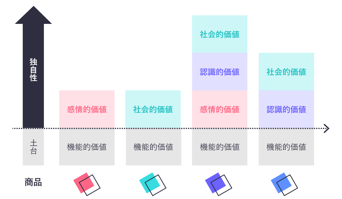 このように、機能的価値を土台に消費者が認識する価値を多様化させ、関係性を構築することが、商品やサービスの独自性を高めるポイントであると言えます。