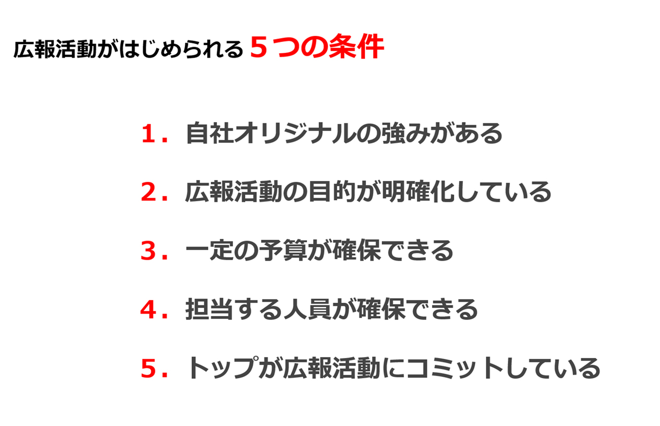 筆者は、企業が広報活動をはじめるにあたって以下の条件が揃っていることが必要だと考えます。