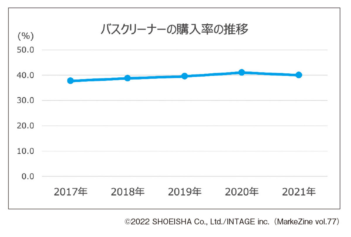 この、こすらずに風呂掃除ができるという新機能を持つタイプは、除菌が出来るタイプや、洗い流すまでの時間をさらに短くしたものなど広がりを見せて、コロナ禍に入って以降も依然として高い販売水準で、バスクリーナー市場内では従来タイプからの置き換わりが着実に進んでいる。2021年12月時点では、「こすり洗い不要のバスクリーナー」タイプトータルの金額シェアは40%を超えている(SRI+データより)。この間の市場環境や生活様式の変化を踏まえて、さらに考察してみる。