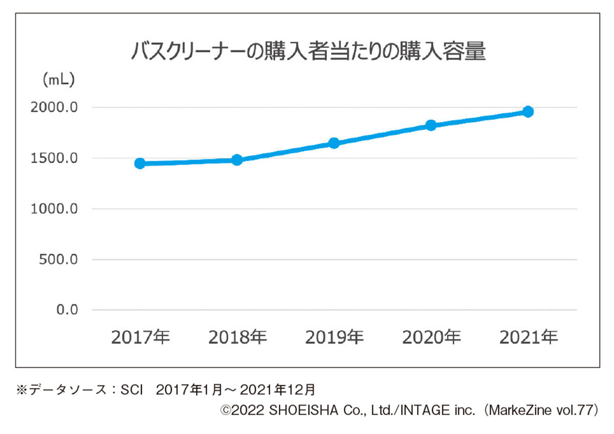 次に、購買者の状況を見てみよう。消費者個人調査のSCIデータ(※2)を確認したところ、この新サブカテゴリーの成長によりバスクリーナー市場全体の購入者数(購入率:間口)が増えたわけではなく、購入した人当たりの金額と容量(奥行)が増えていることがわかる。
