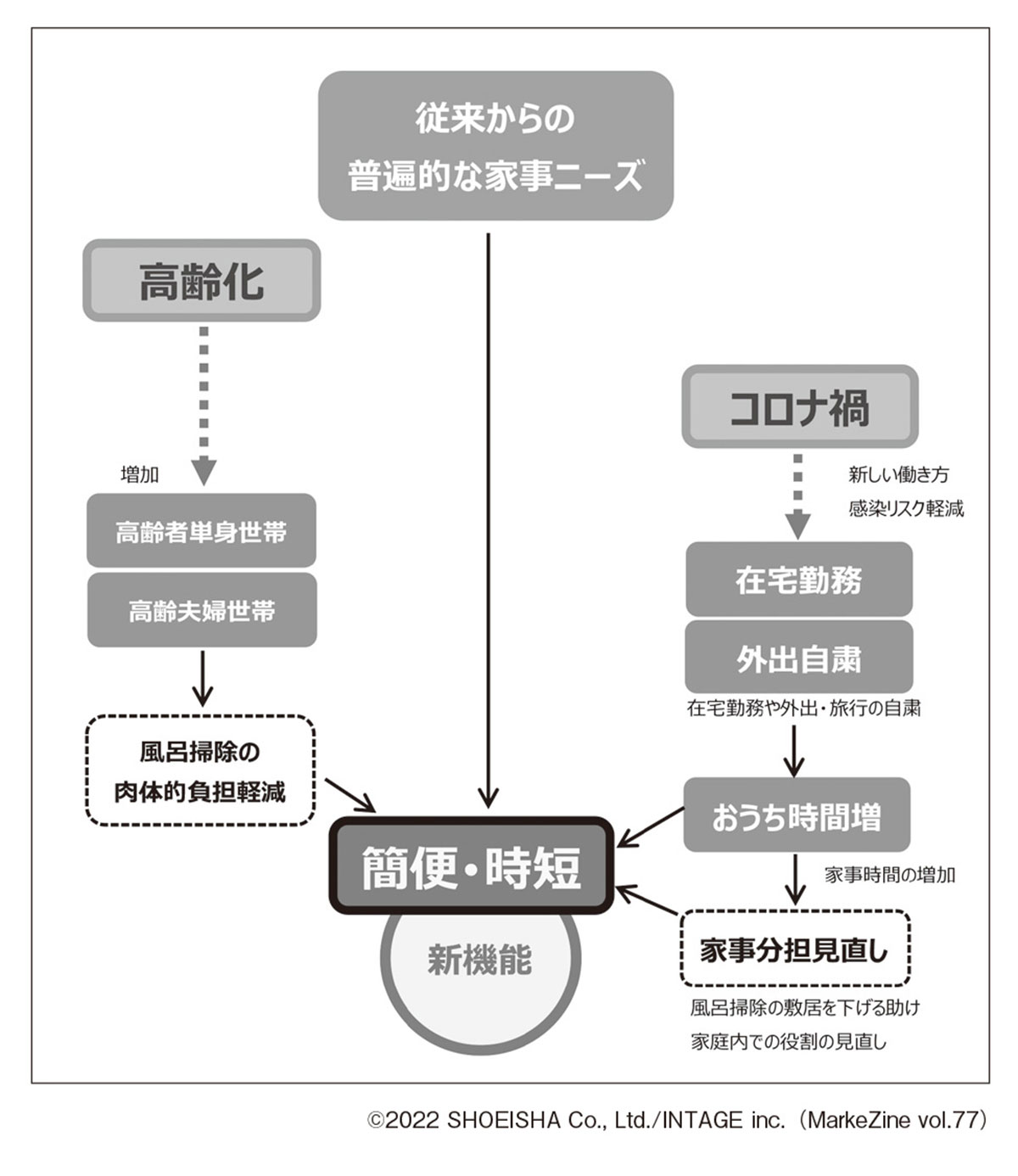 また、新型コロナと関係なく、ゆるやかな市場の変化として「高齢化」にともなう高齢者だけの世帯や高齢者一人暮らしの人が増加傾向にある(総務省統計局の2020年国勢調査の結果より)。風呂掃除の作業が今までになく楽になったこと、「簡便さ」は、家事の負担減という面で、高齢世帯の強力な生活のサポートになるのではないだろうか。