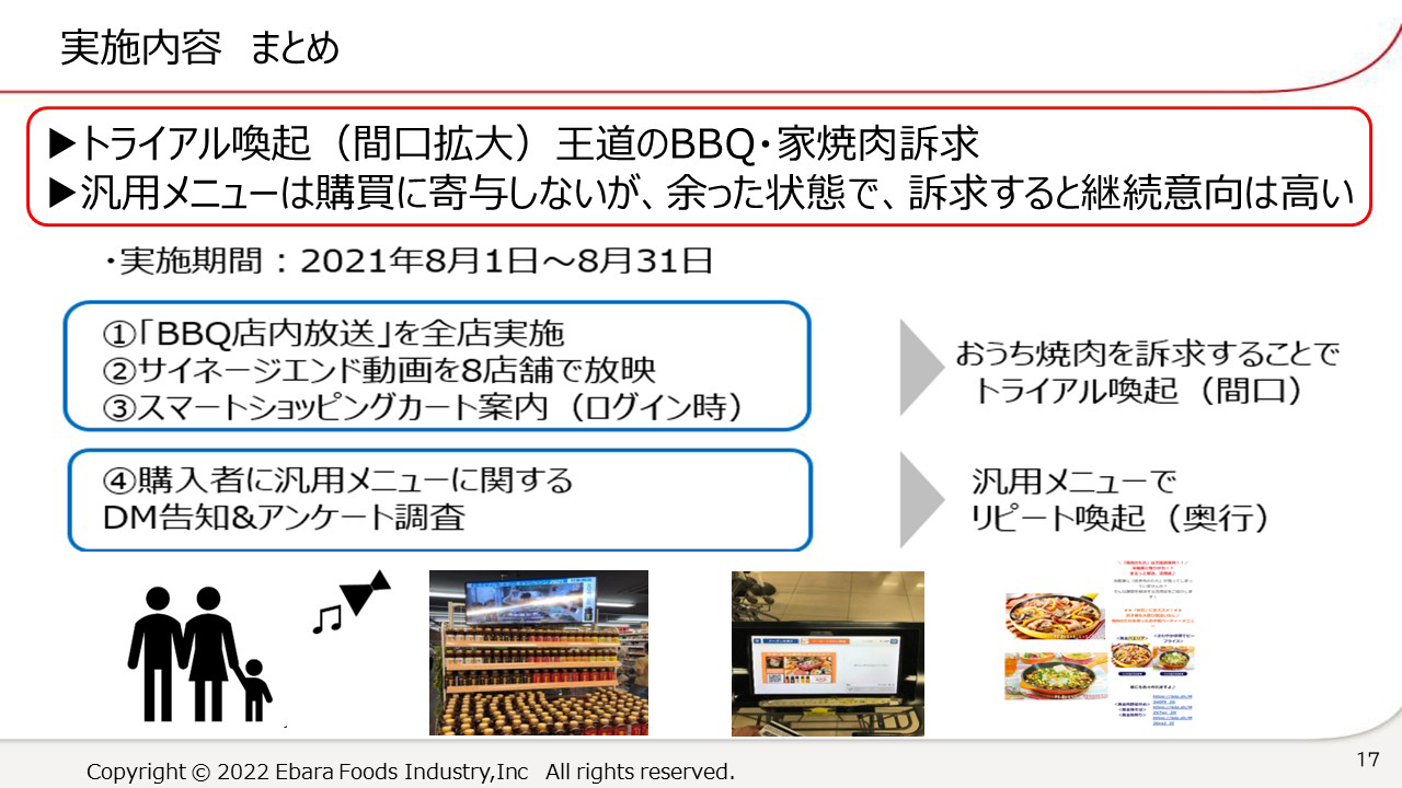 「その結果わかったのは、間口の拡大には王道のBBQ・家庭内訴求が効果的だということです。一方で汎用メニューは購買には寄与しませんでしたが、商品がお家に余っている状態で訴求すると継続意向が高いということもわかりました」(藤原氏)