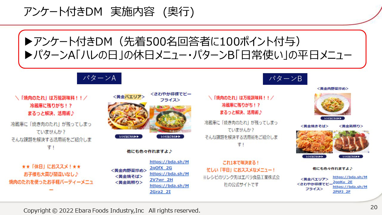 リピート喚起、奥行拡大に向けて行った、「焼肉のたれ」購入者に汎用メニューに関するDM告知を実施するとともにアンケート調査では、「ハレの日」の休日メニューを訴求したパターンA、「日常使い」におすすめな平日メニューのパターンBの2軸に分けて、それぞれの反応を検証していった。
