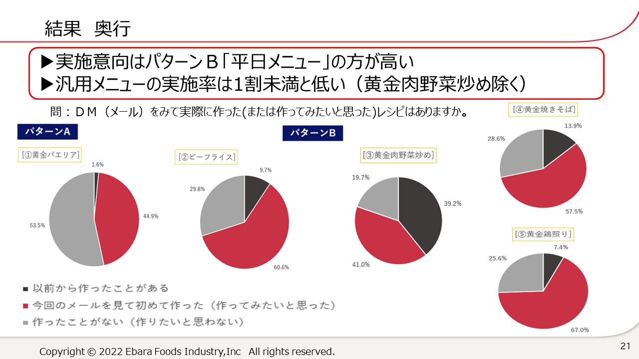 アンケートでは、「DMを見て実際に作った(または作ってみたいと思った)レシピはあるか?」という質問を投げかけたところ、パターンB「平日メニュー」のほうが高い傾向は出たものの、実際に作ってみた実施率は1割と低く、汎用メニューが購買には寄与しないと判明する結果になった。