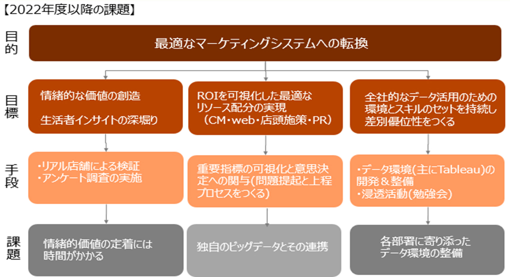 3つ目は、「全社的なデータ活用のための環境とスキルのセットを持続し、差別優位性を作る」こと。この目標を達成するためエバラ食品のマーケティング部では、データ環境の開発と整備、勉強会などを続けていく。その上で、各部署に寄り添ったデータ環境の整備が課題だ。
