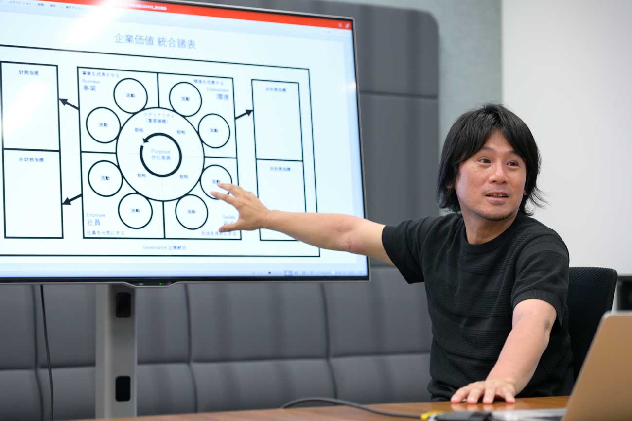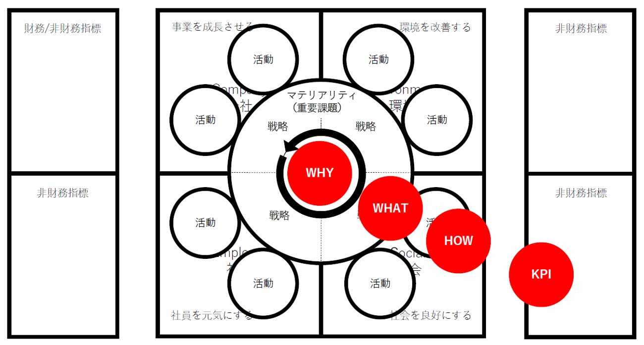 ポイントは、これまでは事業の業績だけを見ていたところに「環境」「社会」「社員」の3つを加え、4つの象限で企業価値を可視化する点。企業が持っているパーパスとそれに基づく戦略、実際に行っている活動、各活動のKPIがこの4象限を一覧すればわかるようになっています。企業として目指す理想と現状を確認したり、競合企業と横並びに比較したりできるのも、フレームワークを用いるからこそのメリットだと思います。