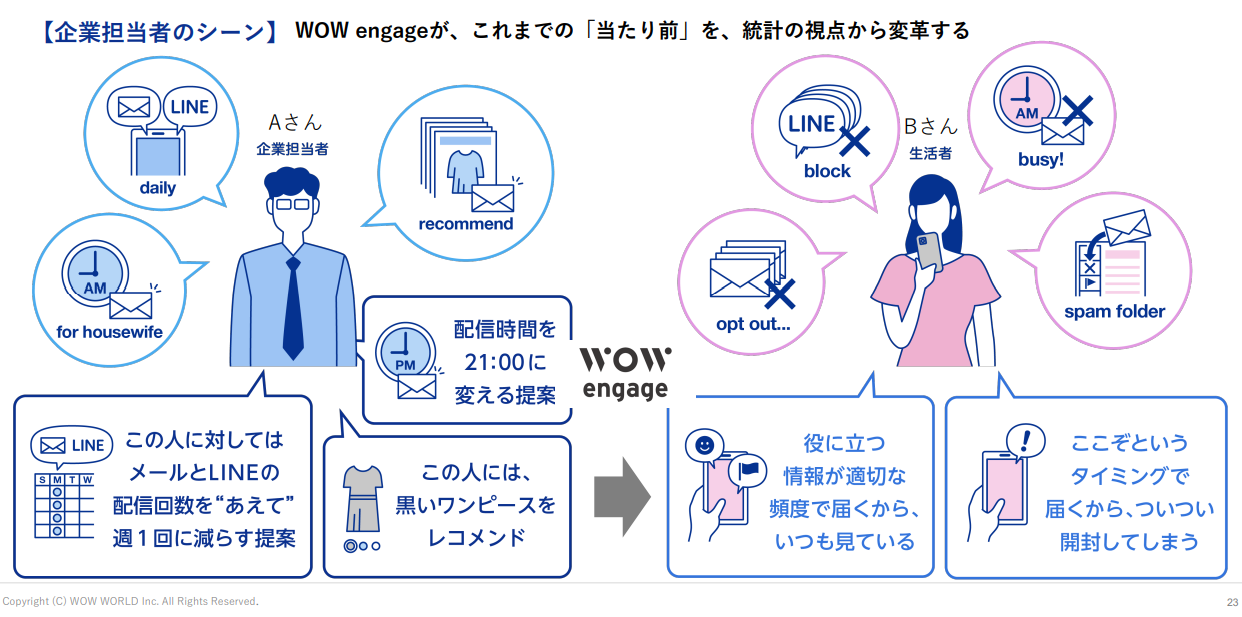 「WOW engageではAさんに『Bさんは青色よりも黒色を好む傾向がある』『Bさんが最も頻繁にメールやLINEを確認する時間帯は朝の9時ではなく夜の9時頃』『Bさんは、同じ内容の情報が何度も送られてくるのを嫌い、週に2回以上メールを送るとドロップアウトする傾向にある』と情報提供します。この情報に基づき、Aさんは黒いワンピースのおすすめ情報を夜の9時に、あえて少ない頻度で送るとしましょう。すると、Bさんの購入促進だけでなく、LTVの向上を果たすことができるのです」(美濃氏)