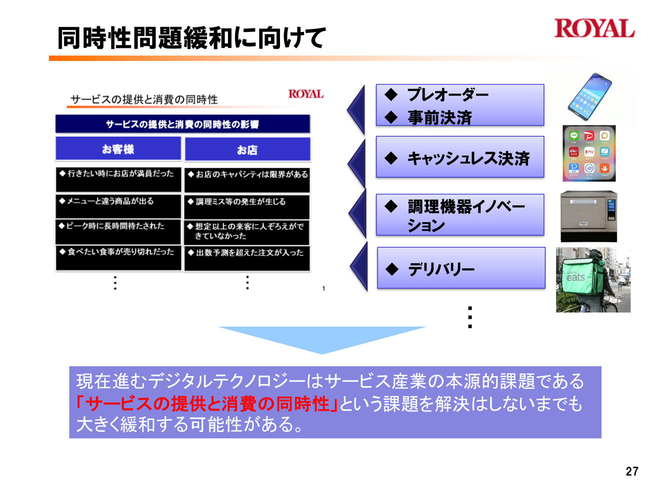 外食産業では、サービスを提供した瞬間に顧客が消費をするため、どうしても起きてしまう問題があった。たとえば店舗が満員で入れなかった、ピーク時に長時間待たされた、食べたいものが品切れだったなどだ。これまでは「しかたない」の一言片付けられてきた問題に対して、様々なテクノロジーによる緩和が期待できる。たとえばプレオーダーや事前決済が進めば、お店に行ったら満員だった、売り切れだったといった問題は発生しにくくなるだろう。