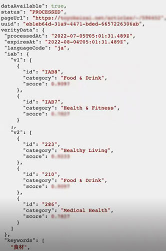 当社のサービスを例にお話ししますと、まず文脈を細かく分類するため700以上のカテゴリーを用意しています。これは米国のIAB(Interactive Advertising Bureau)という業界団体が策定しているインターネットコンテンツのカテゴリーに則ったものです。AIがコンテンツの言語情報や画像情報を解析し、各カテゴリーにどれくらい近いかをスコア化します。スコアが1に近いほどその文脈に近く、「この文脈は0.97なのでほぼ近い」「こちらの文脈は0.6だからまあまあ近い」といった具合に判定が行われます。