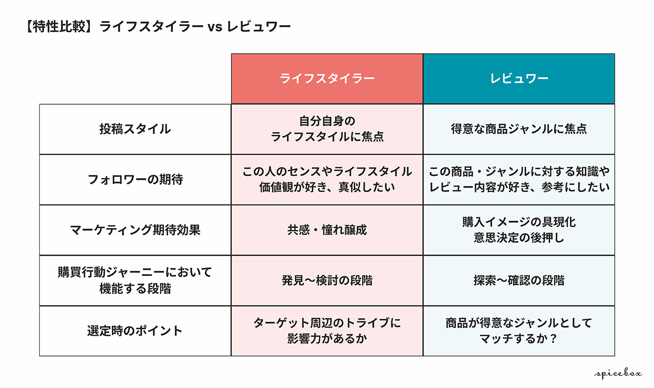 ここまでの話を表にまとめます。ライフスタイラーとレビュワーはインフルエンサーとしてのコンセプト、フォロワーからのニーズ、マーケティング上期待できる効果、消費者の購買行動ジャーニーにおける機能、選定する際のポイント……これらすべてが異なります。