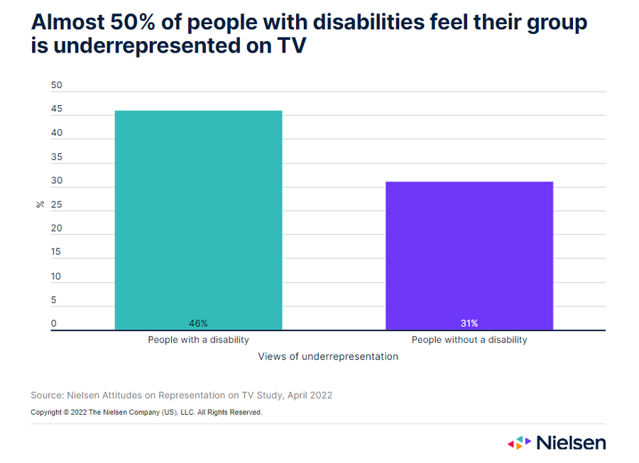 ニールセンの調査では、障がいを持つ人の50%近くが、テレビで自分のアイデンティティグループが十分に表現されていないと感じていることがわかっています。マジョリティが一方的に表現するマイノリティは、本質的な視点を捉えていない可能性が高い事実が現れています。