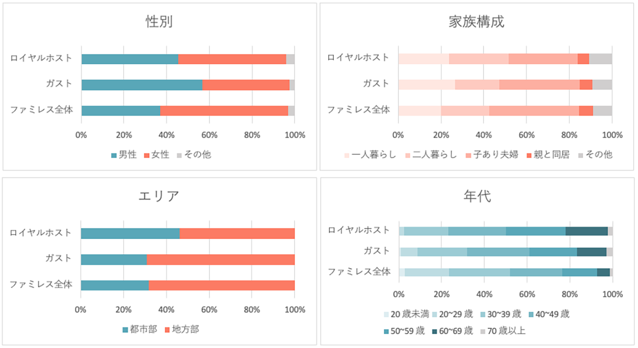 各ブランドのロイヤル層の属性とブランドの利用シーンについては、ガストのほうが単身世帯・若年男性層に利用されている比率がやや高い。一方ロイヤルホストのほうが、都市部に多くロイヤル層を抱えている。
