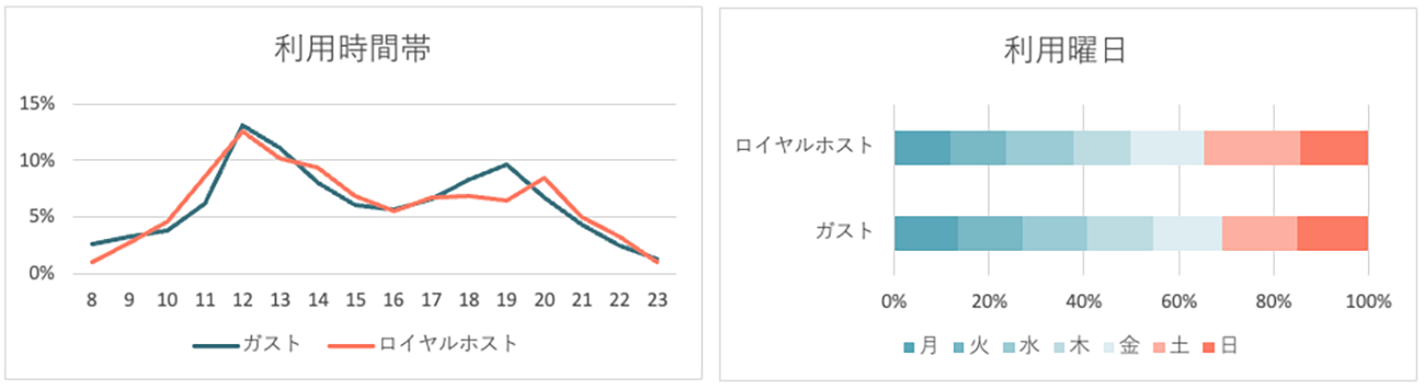 利用時間帯では、お昼ご飯と夜ご飯の時間帯にピークを迎えることは各ブランド同様だが、夜ご飯のピークはガストが19時頃なのに対して、ロイヤルホストは20時頃と少し遅めであった。また、いずれのブランドも平日より休日利用が中心であった。ロイヤルホストは、ファミリーレストランの名の通り家族の団らんを目的としたゆったりと食事をする場として利用されることが多いのかもしれない。