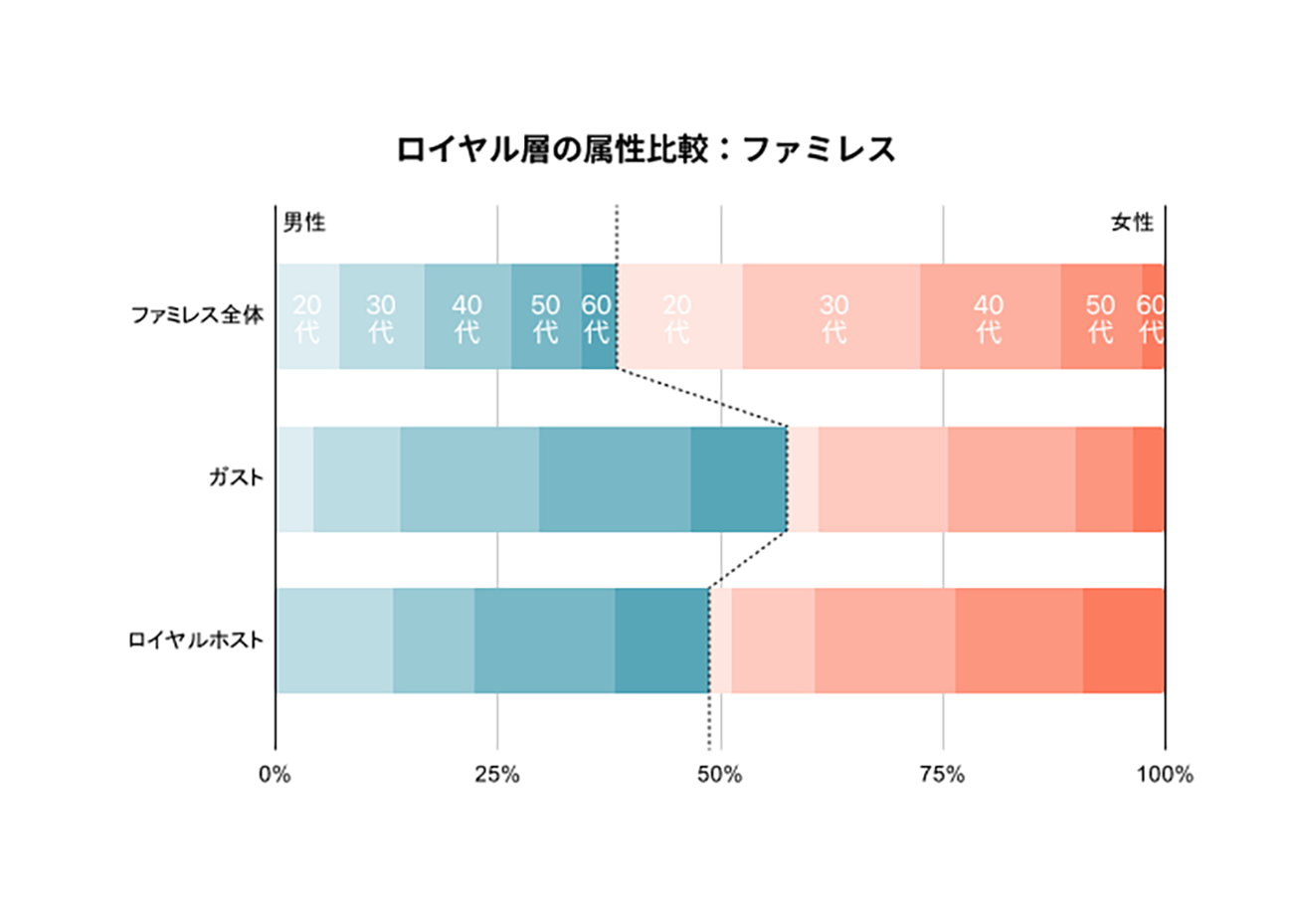 まず、ファミリーレストラン大手のガストとロイヤルホストを比較する。構成比の分布は似通っているが、ガストのほうがややロイヤルティの高い層が多い。