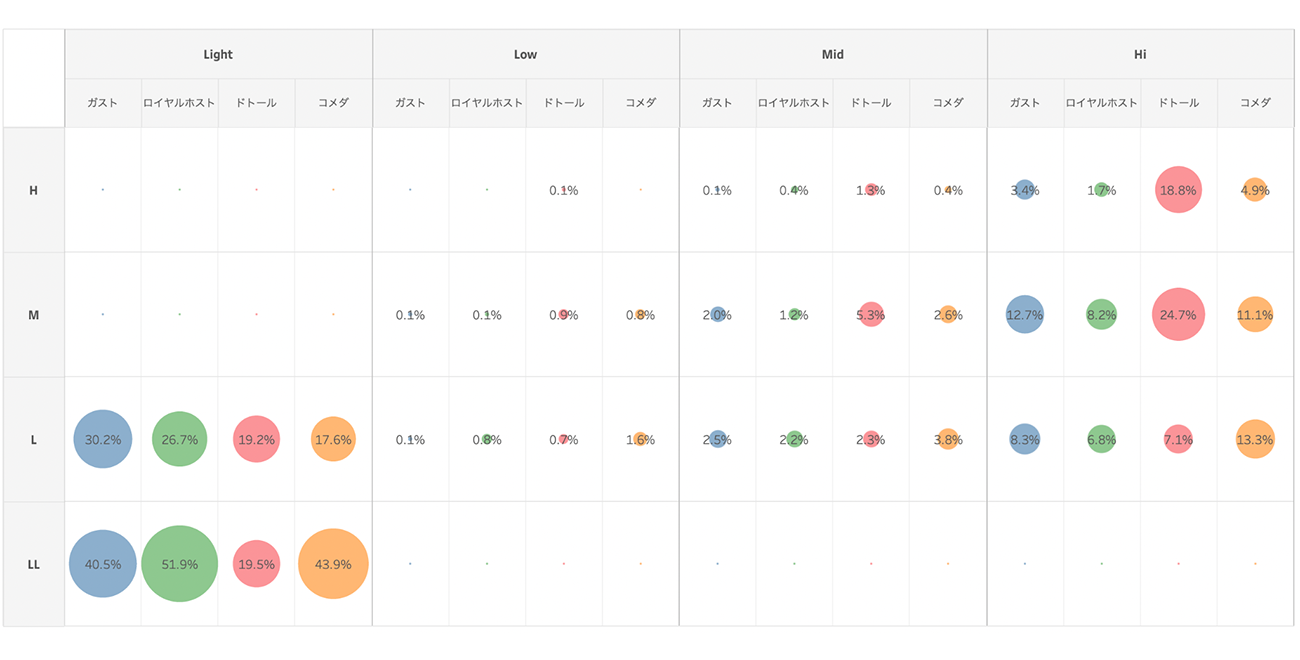 人数構成比を%で示し、各セグメントの支出総額を円の大きさで表現
